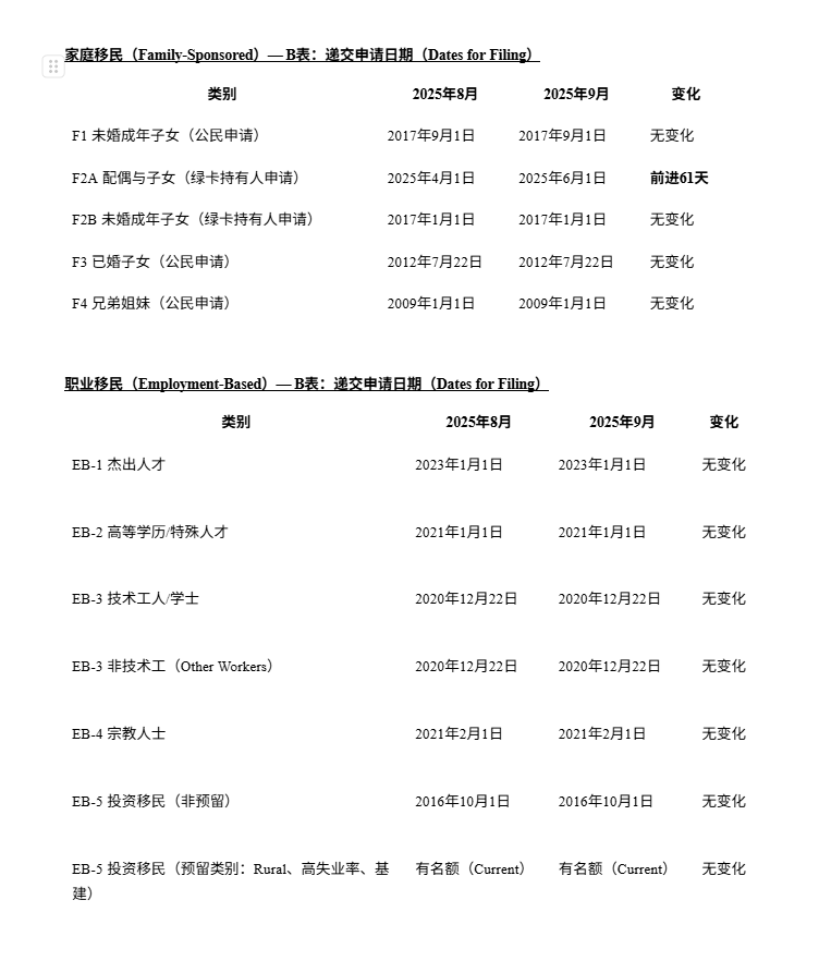 如果申请人身在美国并准备递交I-485 调整身份申请,移民局公布这个月亲属移民使用B表(Dates for Filing)(F2A绿卡配偶移民申请则使用A表,即无排期)和职业移民使用A表 (Final Action Dates)